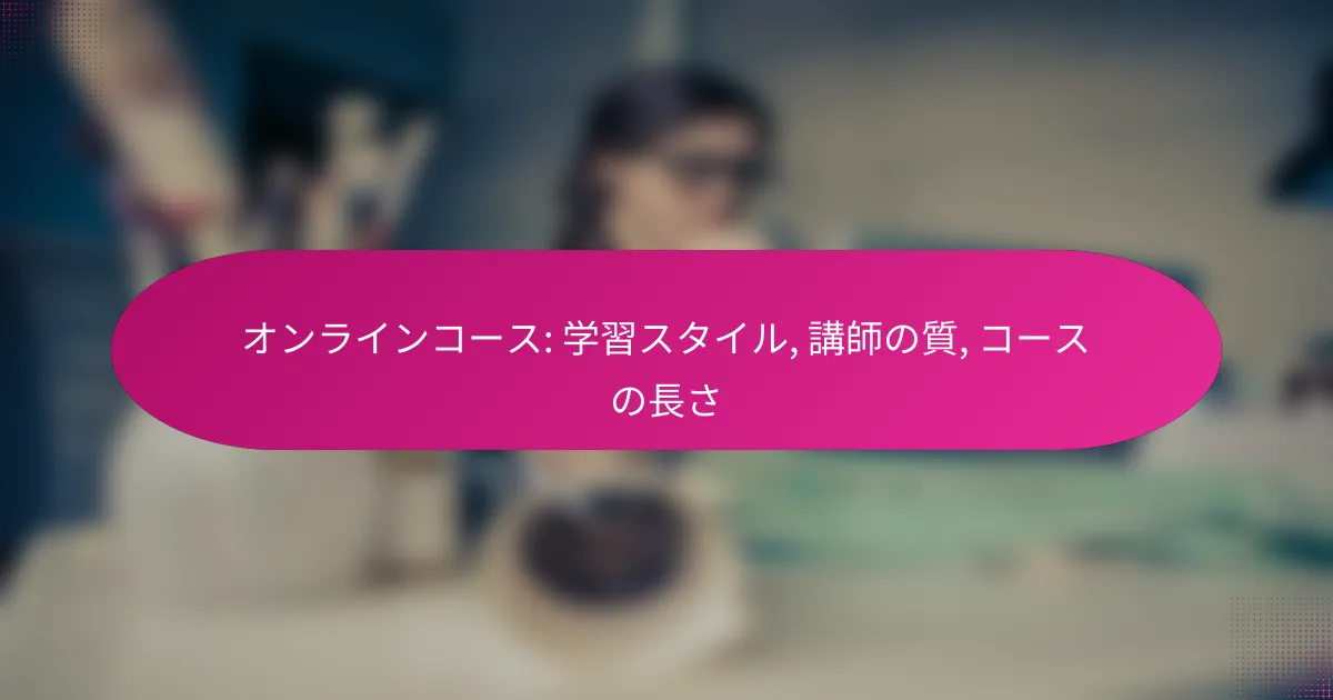 オンラインコースは、学習スタイル、講師の質、コースの長さといった要素が学習効果に大きく影響します。学習者が最も効果的に情報を吸収できるスタイルに合わせたアプローチや、質の高い講師による指導が求められます。また、コースの長さも受講者の集中力を考慮し、適切に設定されることが重要です。 オンラインコースの学習スタイルとは何か? オンラインコースの学習スタイルは、学習者が情報を最も効果的に吸収する方法を指します。視覚、聴覚、体験的なスタイルがあり、それぞれのスタイルに応じたアプローチが学習効果を高めることができます。 視覚的学習スタイルの特徴 視覚的学習スタイルの学習者は、図やグラフ、ビジュアルコンテンツを通じて情報を理解しやすくなります。彼らは色や形を使った教材を好み、視覚的な刺激が記憶を助けます。 このスタイルに合ったオンラインコースでは、動画やインフォグラフィック、スライドプレゼンテーションが多く使用されます。視覚的要素が豊富な教材は、学習者の注意を引きつけ、理解を深める助けになります。 聴覚的学習スタイルの特徴 聴覚的学習スタイルの学習者は、音声や音楽を通じて情報を吸収することが得意です。彼らは講義やディスカッションを通じて学ぶことを好み、聴覚的な刺激が記憶を強化します。 このスタイルに適したオンラインコースでは、ポッドキャストや音声解説、ウェビナーが効果的です。聴覚的要素が多い教材は、学習者が内容をよりよく理解し、記憶するのに役立ちます。 体験的学習スタイルの特徴 体験的学習スタイルの学習者は、実際の体験や実践を通じて学ぶことを重視します。彼らは手を動かし、実際に試すことで理解を深める傾向があります。 このスタイルに合ったオンラインコースでは、シミュレーションやプロジェクトベースの学習が取り入れられます。実践的なアプローチが学習者の興味を引き、知識を定着させるのに効果的です。 学習スタイルの選び方 学習スタイルを選ぶ際は、自分の好みや過去の学習経験を考慮することが重要です。自己評価を行い、どのスタイルが最も効果的かを見極めることが第一歩です。 また、異なるスタイルを組み合わせることで、より効果的な学習が可能になります。例えば、視覚と聴覚を組み合わせた教材を利用することで、理解が深まることがあります。 学習スタイルに基づくコースの選択基準 コースを選ぶ際は、自分の学習スタイルに合った教材や教授法を確認することが重要です。コースの説明やレビューを読み、視覚的、聴覚的、体験的な要素がどの程度含まれているかをチェックしましょう。 さらに、体験的な要素があるコースは、実践的なスキルを身につけたい学習者にとって特に有益です。自分のニーズに合ったコースを選ぶことで、学習効果を最大化できます。 講師の質はどのように評価されるか? 講師の質は、受講生の学習体験に大きな影響を与えるため、評価基準が重要です。一般的には、経験、専門性、受講生からのフィードバック、教え方のスタイル、資格や認証、サポート体制が考慮されます。 講師の経験と専門性の重要性 講師の経験と専門性は、質の高い教育を提供するための基盤です。実務経験が豊富な講師は、理論だけでなく実践的な知識を持っており、受講生に具体的な事例を通じて学びを深めることができます。 専門性が高い講師は、特定の分野において深い理解を持ち、最新の情報や技術を提供することが可能です。これにより、受講生は市場で求められるスキルを身につけやすくなります。 受講生のフィードバックの役割 受講生からのフィードバックは、講師の質を評価する上で非常に重要です。受講生の意見を集めることで、講師は自分の教え方や内容を改善する手がかりを得ることができます。