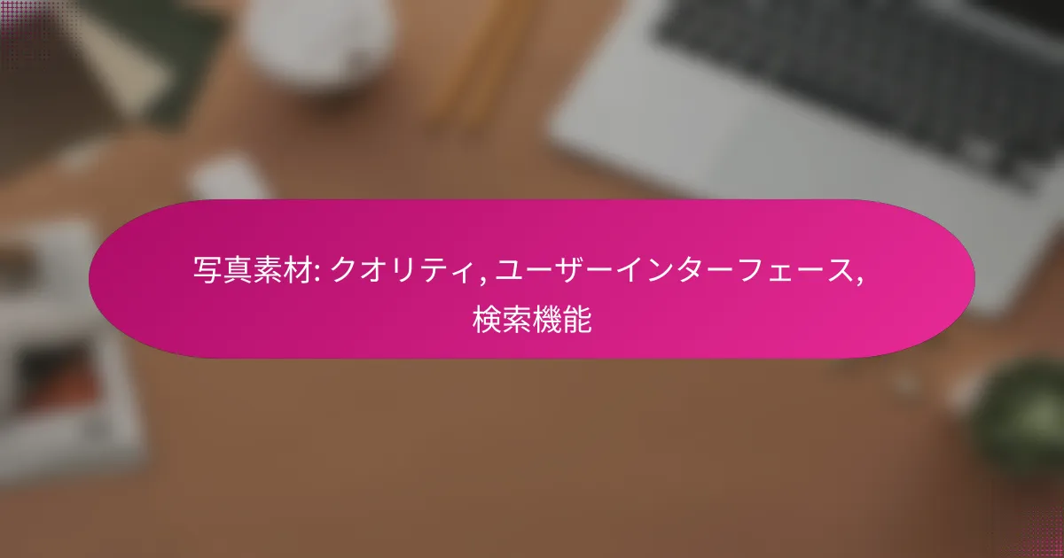写真素材のクオリティは、鮮明さや解像度、色彩の正確さによって評価され、高品質な素材はプロフェッショナルな用途に最適です。また、ユーザーインターフェースの使いやすさは、効率的な検索と利用を促進し、ユーザー満足度を向上させます。さらに、効果的な検索機能は、必要な素材を迅速に見つけるために不可欠です。 写真素材のクオリティは何ですか? 写真素材のクオリティは、画像の鮮明さ、解像度、色彩の正確さ、そして使用許可に基づいて評価されます。高品質な素材は、プロフェッショナルな用途に適しており、視覚的なインパクトを与えることができます。 高品質な写真素材の定義 高品質な写真素材とは、視覚的に魅力的で、商業的な利用に耐えうる画像を指します。これには、適切な解像度、色の再現性、そして全体的な構成が含まれます。一般的に、印刷用には300dpi以上、ウェブ用には72dpi以上が推奨されます。 写真素材の解像度とサイズの重要性 解像度は、画像の詳細度を示し、サイズは使用する媒体に適したものである必要があります。高解像度の画像は、印刷物や大画面での表示に適していますが、ファイルサイズが大きくなるため、ウェブ用には適度なサイズに圧縮することが重要です。 ライセンスと著作権の影響 写真素材のライセンスは、使用方法に大きな影響を与えます。商業利用が可能な素材と、個人利用のみの素材では、選択肢が異なります。著作権を遵守することは、法的なトラブルを避けるために不可欠です。 ユーザーのニーズに応じたクオリティ基準 ユーザーのニーズに応じたクオリティ基準は、プロジェクトの目的に基づいて異なります。たとえば、広告用の画像は、視覚的なインパクトが求められるため、より高いクオリティが必要です。一方、ブログ用の画像は、コストを抑えつつも適切なクオリティを維持することが重要です。 クオリティ評価のためのツールと基準 写真素材のクオリティを評価するためには、いくつかのツールや基準があります。画像編集ソフトウェアを使用して解像度や色彩を確認することが一般的です。また、オンラインのレビューや評価サイトを参考にすることで、他のユーザーの意見を得ることも有効です。 ユーザーインターフェースの重要な要素は何ですか? ユーザーインターフェースは、ユーザーが写真素材を効率的に検索し、利用するための重要な要素です。直感的で使いやすいインターフェースは、ユーザーの満足度を高め、再利用を促進します。 直感的なナビゲーションの設計 直感的なナビゲーションは、ユーザーが目的の写真素材に迅速にアクセスできるように設計されています。メニューやカテゴリーを明確に表示し、ユーザーが迷わないようにすることが重要です。 例えば、主要なカテゴリを目立たせ、サブカテゴリを階層的に整理することで、ユーザーが必要な素材を簡単に見つけられるようになります。 視覚的な一貫性とブランドアイデンティティ 視覚的な一貫性は、ユーザーがインターフェースを理解しやすくするために不可欠です。色使いやフォント、ボタンのスタイルを統一することで、ブランドのアイデンティティを強化できます。 例えば、特定の色合いを使用することで、ユーザーはそのブランドをすぐに認識でき、信頼感を持つようになります。 レスポンシブデザインの必要性 レスポンシブデザインは、さまざまなデバイスでのユーザー体験を向上させます。スマートフォンやタブレットでも快適に利用できるように、画面サイズに応じてレイアウトを調整することが求められます。 例えば、画像のサイズや配置をデバイスに合わせて変更することで、ユーザーはどのデバイスでもスムーズに操作できます。 ユーザーエクスペリエンスを向上させる機能